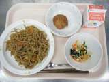 今日の給食は、ソース焼きそば、牛乳、豆もやしとわかめの中華あえ、サーターアンダー...