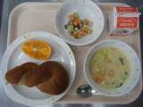 今日の給食は、セレクトパン、牛乳、ビーンズサラダ、えびのクリームスープ、くだもの...