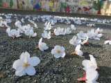 桜の花が咲き始めました。 でも、雨風で、今朝の校庭にいくつもの花が散ってしまって...