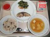 今日の給食は、赤飯、牛乳、魚の照り焼き、ほうれん草の乾物あえ、沢煮椀、紅白ゼリー...