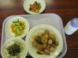 今日の献立は、ご飯、牛乳、ふりかけ、春野菜のうま煮、ひとしお野菜です。