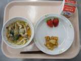 今日の給食は、ちゃんこうどん・牛乳・いかとじゃが芋の揚げ煮・くだもの(いちご)で...