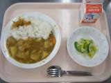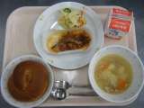 今日の給食は、チキンカレーライス・牛乳・コーン入りフレンチサラダ・福神漬けです。...