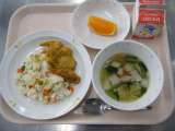 今日の給食は、三色ピラフ・牛乳・鶏肉のカレー焼き・白菜のスープ・くだもの(デコポ...