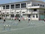 青空の下、体育「ハードル走」の学習です。自分に合うインターバルを選び、ハードルを...