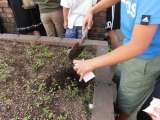 理科の学習では、ヘチマを育てます。 1人ずつ花壇の土を牛乳パックに入れて、種を植...