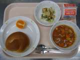 今日の給食は、ミルクパン、牛乳、野菜ソテー、ビーンズシチュー、くだもの(カラマン...