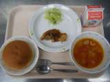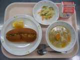 今日の給食は、ツナコーンサンド、牛乳、白いんげんの田舎風スープ、フレンチサラダ、...