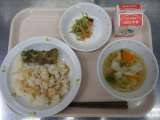 今日の給食は、たけのこごはん、牛乳、ちくわの磯辺揚げ、野菜のごまあえ、白菜汁です...