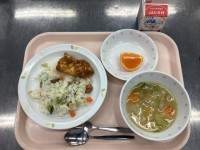 今日の給食は、三色ピラフ、牛乳、鶏肉のカレー焼き、キャベツスープ、くだもの(カラ...
