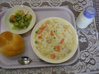 今日のメニューは、ショートニングパン、牛乳、コーンシチュー、 フレンチサラ...