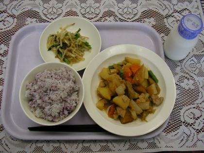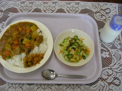 今日のメニューは、カレーライス、牛乳、福神漬け、野菜の甘酢かけです。