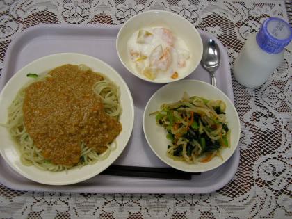 今日のメニューは、ジャージャー麺、牛乳、ナムル、フルーツヨーグルトです。