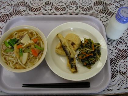 今日のメニューは、煮込みうどん、ししゃもとさつまいもの天ぷら、 野菜の煮びたし...