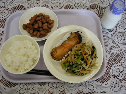 今日のメニューは、ごはん、魚のマヨネーズ焼き、煮豆、おひたしです。アレルギー対...