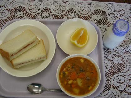 今日のメニューは、ジャムパン、牛乳、ビーンズシチュー、くだものです。