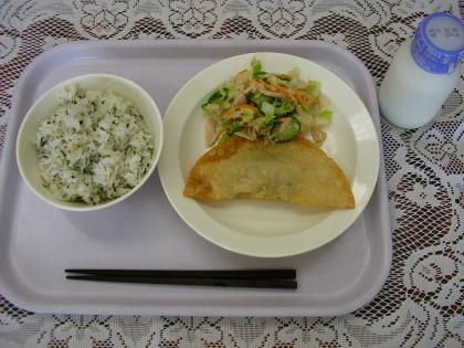 今日のメニューは、青菜とじゃこのごはん、牛乳、ジャンボ餃子、ツナサラダです。