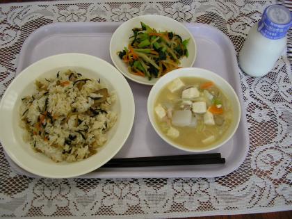 今日のメニューは、ひじきごはん、牛乳、豚汁、野菜のからしのしょうゆかけです。