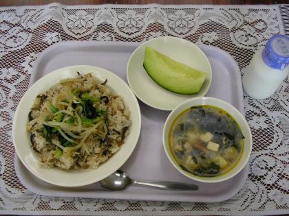 今日のメニューは、ビビンバ、わかめスープ、くだもの、牛乳です。