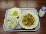 今日の献立は、わかめとじゃこのご飯、牛乳、しんじゃがいものそぼろ煮、キャベツの...