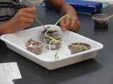 インゲンマメの成長を確認しています。 種子が成長するために必要なものをみんなで整...