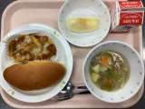 今日の給食は、ミルクパン、牛乳、ラザニア風、田舎風スープ、くだもの(りんご)です...
