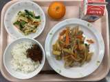 今日の給食は、ごはん、牛乳、かつおでんぶ、きんぴら煮、青菜と揚げのひたし、くだも...