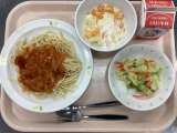 今日の給食は、スパゲティ地中海ソース、牛乳、キャベツサラダ、フルーツヨーグルトで...