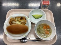 今日の給食は、ミルクパン、牛乳、ラザニア風、田舎風スープ、くだもの(メロン)です...