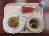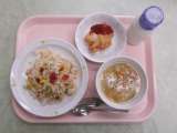 【献立】 ナシゴレン 牛乳 野菜スープ 大豆とコーン...