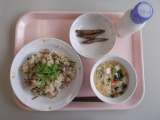 【献立】 磯おこわ 牛乳 かきたま汁 きびなごのから...