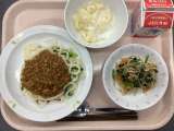 今日の給食は、ジャージャーうどん、牛乳、塩ナムル、パインヨーグルトです。