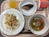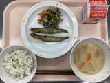 今日の給食は、麦ごはん、牛乳、さばの七味焼き、カリカリ油揚げと野菜のひたし、かき...
