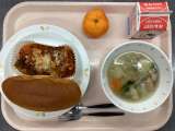 今日の給食は、パンプキンパン、牛乳、なすのグラタン、ウィンナーと野菜のスープ煮、...