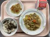 今日の給食は、麦ごはん、牛乳、ひじきのふりかけ、じゃがいものそぼろ煮、もやしのか...