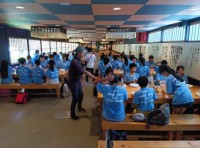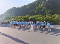いい天気です。朝の集いは、クラスTシャツを着て集合しました。今日の青空の色と同じ...