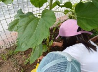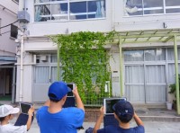 ヘチマとツルレイシの水やり当番。家で観察カードを仕上げるために、タブレットで撮影...