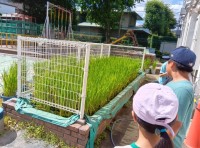 田んぼとバケツ稲の水やり当番の子どもたちです。水やりが終了したら、放送室で観察カ...
