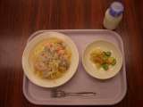 今日の給食は、スパゲティクリームソース 牛乳 ポテト入りフレンチサラダ です。 ...