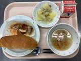 今日の給食は、ミルクパン、牛乳、魚のピザ風、ジャーマンポテト、コンソメスープです...