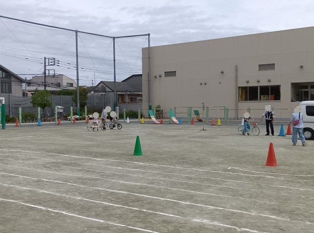 3年生は、警察の方、保護者の方の協力をいただきながら、自転車教室を行いました。「右、左、右、うしろ」と、自転車走行前の確認の仕方を学び、実際に自転車を運転して、校庭を走りました。3年生は、この自転車教室を終えると、1人で走行が可能としています。警察の方の話を真剣に聞いていました。
