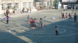 集会委員の子どもたちが、朝校庭にラインを引き始めました。