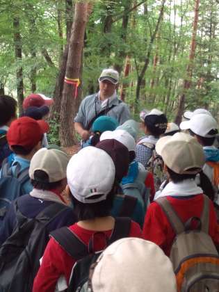 山頂に到着しました。ヨッシーの環境プログラムは「クロモジ」という木の話です。昔の人は、この木を歯ブラシにしていたそうです。