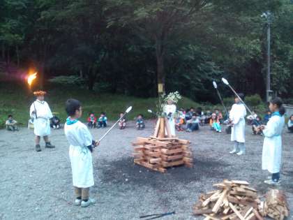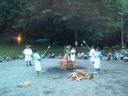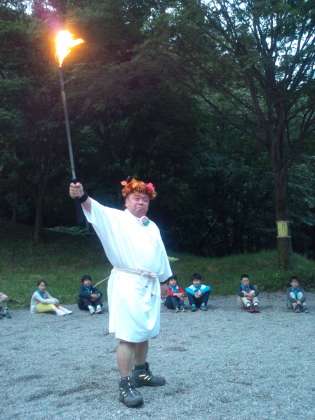 火の神、エレファン・ピッカリーノ・チャロンプロップ・バリストン、略してキャリーと火の子が松原小の子どもたちに神聖な火を授けに来ました。