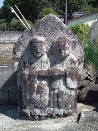 足踏み道祖神、夫婦が仲良く手を取り合いながら、足は踏んづけ合っています。