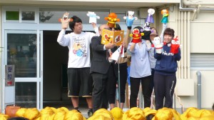 今日の全校朝会では、アンパンマンのキャラクターが登場しました。