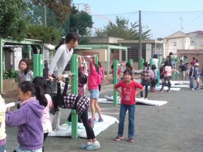 鉄棒にすずなり(明日、本校で研究授業)