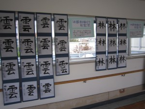 会議室において光明特別支援学校のお友だちの作品や書道サークルの