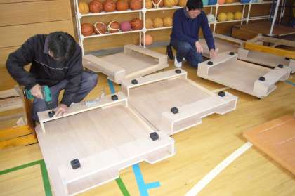 もうすぐ完成。体育館で仕上げをしています。この制作物は、児童が20日(月)から体育の時間に使用します。使用する様子は、今後の学校日記をお楽しみにお待ちください。(副校長)