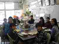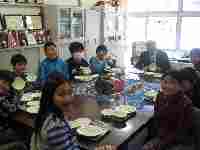 6年2組が校長室で会食を行いました。空のお皿をもって「ごちそうさま」の笑顔です。